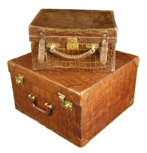 A crocodile square suitcase, with brass locks to a silk interior having elasticated pockets 18.25in (46.5cm) w, and a crocodile suitcase having a green watered silk interior with pockets and previously with lift out manicure set. (2)