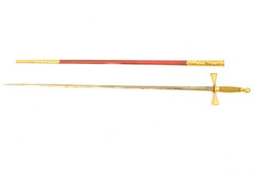A Masonic sword, by G. Kenning & Son, London, Liverpool, Manchester, Glasgow, with an etched blade and gilt metal gilt and leather scabbard, 33in (84cm) l.