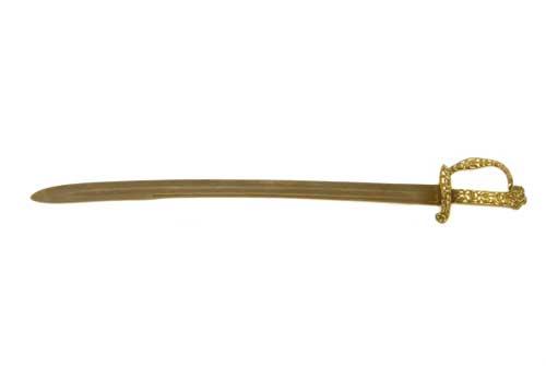An early 18th century hunting sword, with a slightly curved fullered 25.75in (65.5cm) blade, with running fox and orb armourer's marks to both sides, with a brass and enamel hilt decorated foliage and a animal mask with curled horns.