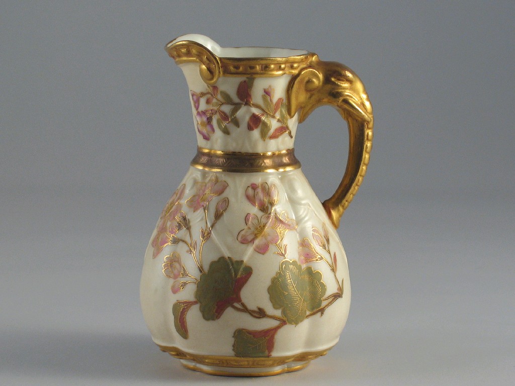 A Royal Worcester jug, with an elephant handle, decorated with flowers and leaves, c.1874, 11.5cm.