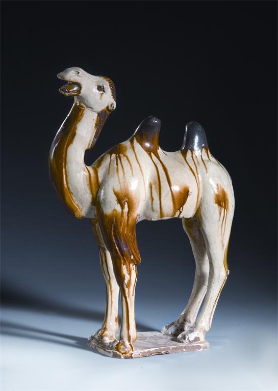 A Chinese treacle-glazed pottery model of a bactrian camel, his head raised, Tang dynasty 618-906 AD, 52cm.