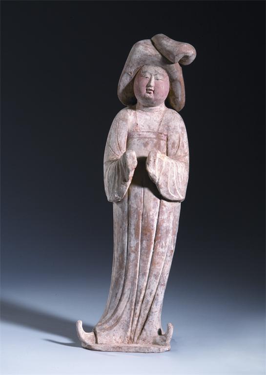 A large Chinese pottery model of a matron, with flowing robes, rouged cheeks and upturned toes, Tang dynasty 618-906 AD, 48cm. Kotalla Report, 08140104, 25th January 2004. Sold with no reserve