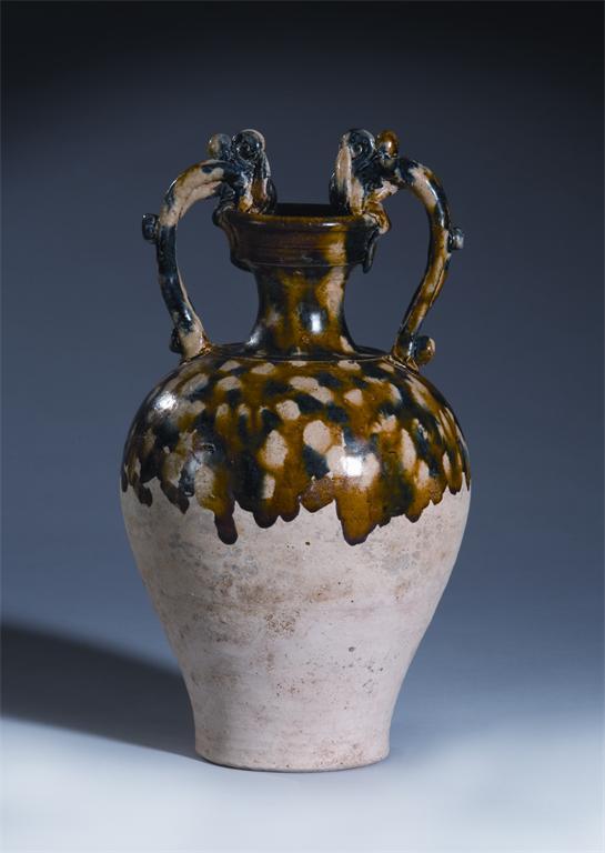 A Chinese pottery blue sancai splashed two-handled dragon amphora