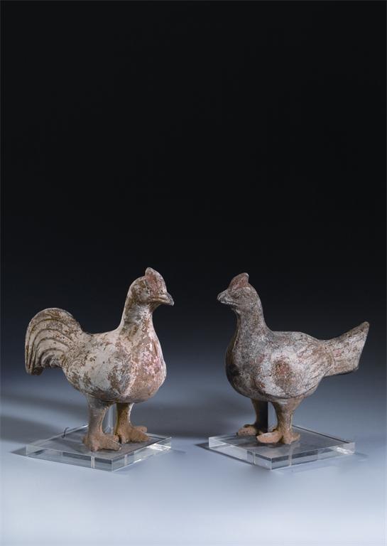 A pair of Chinese unglazed pottery models of chickens, Tang dynasty 618-906 AD, 23cm. (2) Sold with no reserve