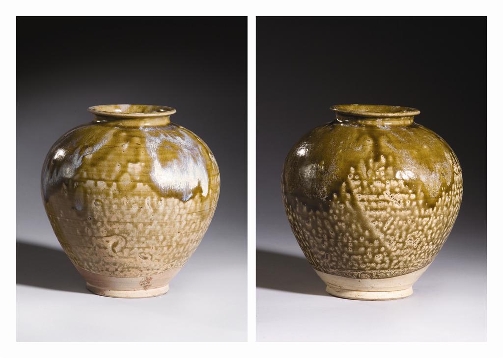 A rare pair of Chinese phosphatic and olive-green glazed ovoid jars