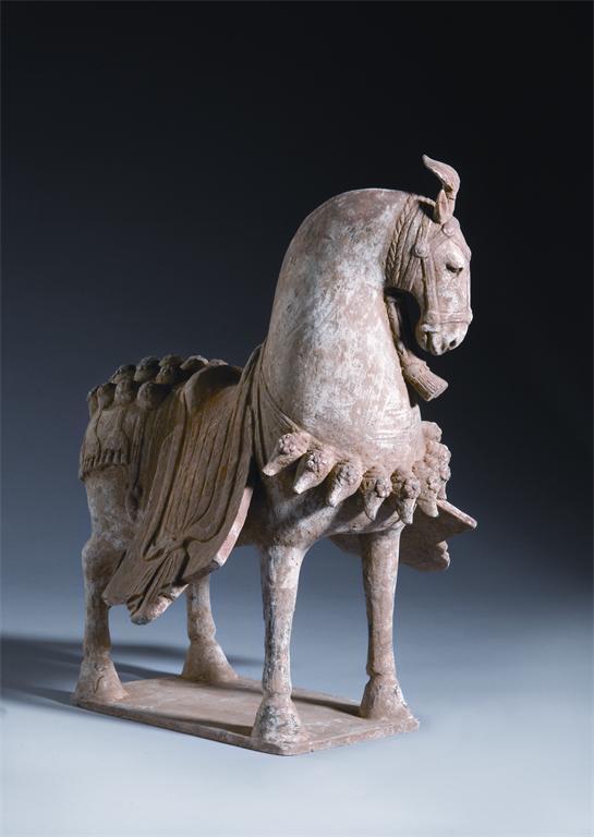 Similar horses have been excavated from around the site of the Northern Wei capital Luoyang. Cf: The figure from the tomb of Yuan Shao with a similar knotted saddle cloth in Kaogu, 1973, no. 4, pl. 11:1.