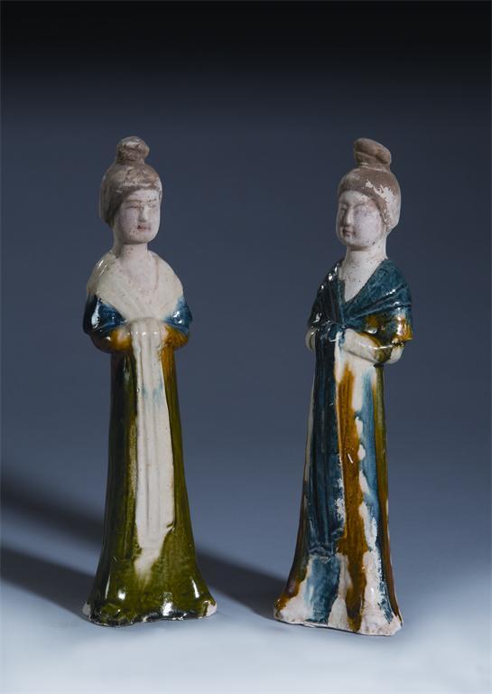 A pair of Chinese pottery blue sancai-glazed models of maidens