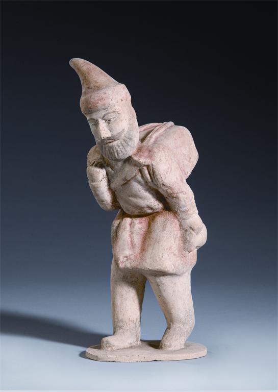 A Chinese unglazed pottery model of a foreigner, carrying a pack on his back and holding a jug in his left hand, Tang dynasty 618-906 AD, 26.5cm. Provenance: Nicholas Pitcher Oriental Art, London. Sold with no reserve