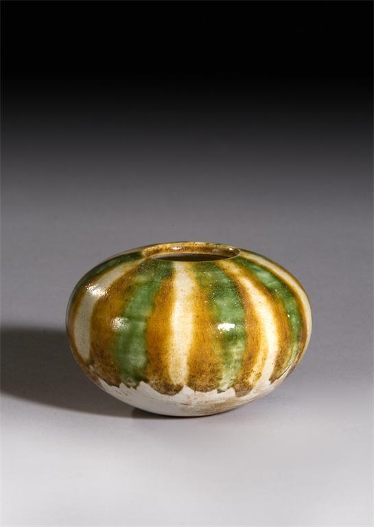 A small Chinese pottery sancai-glazed ointment pot, Tang dynasty 618-906 AD, 7cm.