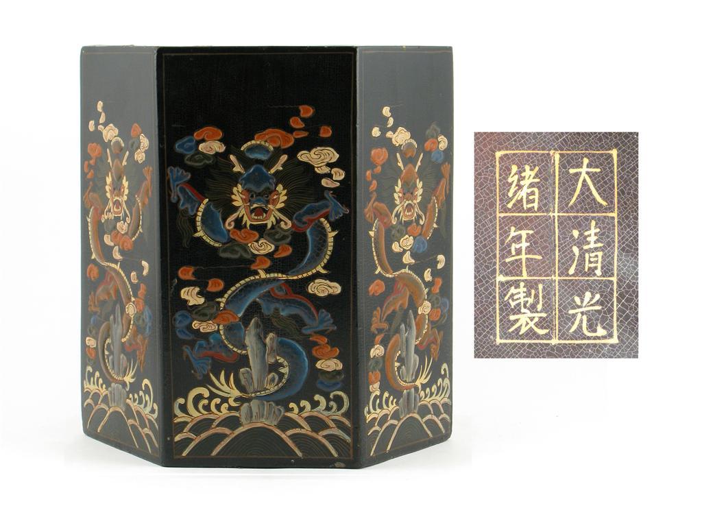 A Chinese black lacquer hexagonal vase or scroll pot, decorated with six confronting five clawed dragons rising from waves, the base with six character Guangxu mark and of the period 1875-1908, small chips, flakes and wear, 25cm.