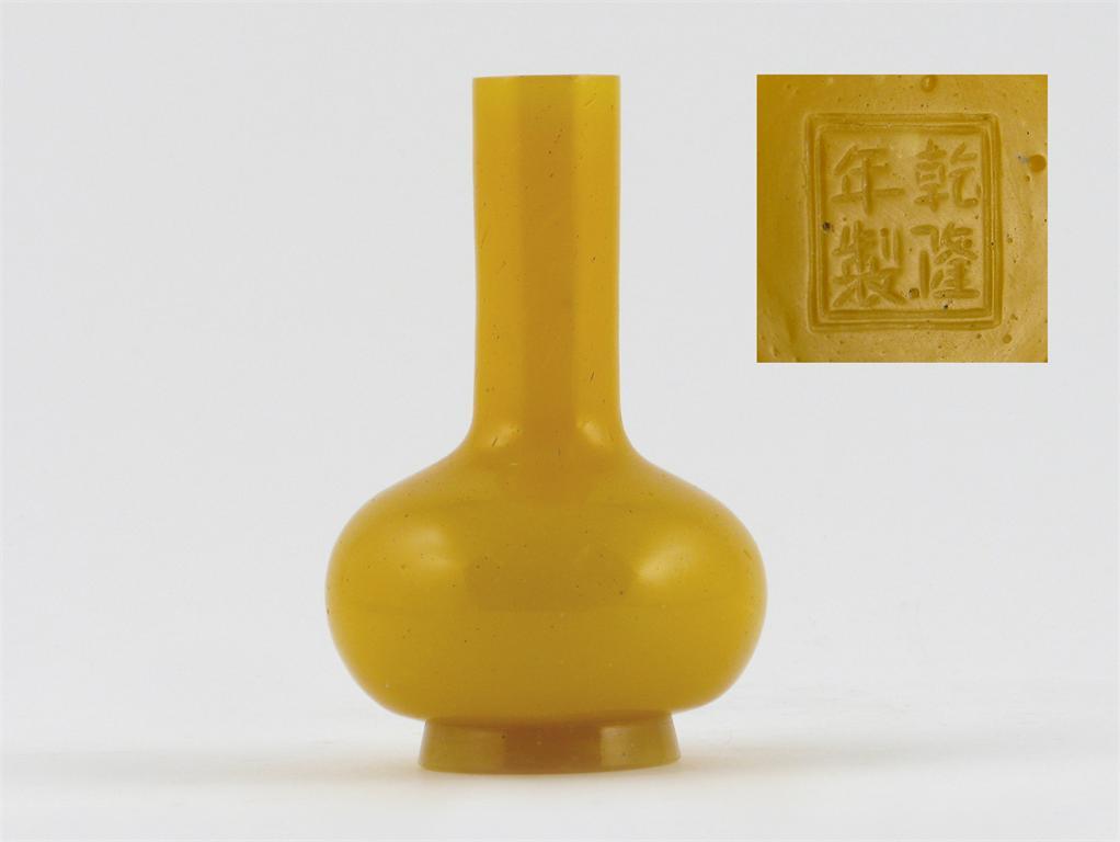 A Chinese yellow Beijing glass bottle vase, with a cylindrical neck and compressed circular body, thje base with a four character Qianlong mark and probably of the period, a tiny rim fleck, 13cm.