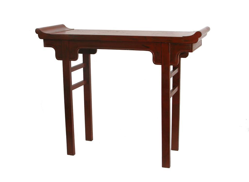 Two red lacquer altar tables, with upturned scroll ends, wear, 110cm long x 88cm high. (2)