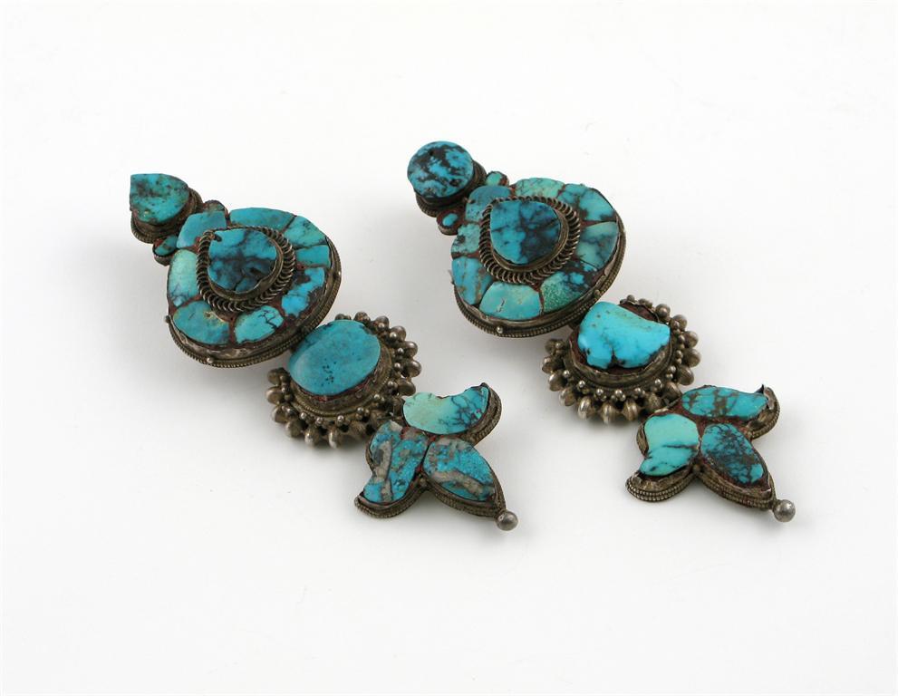 A pair of Tibetan silver and turquoise earrings, each inset with many plaques and with beaded borders, 19th century, 12.5cm. (2)
