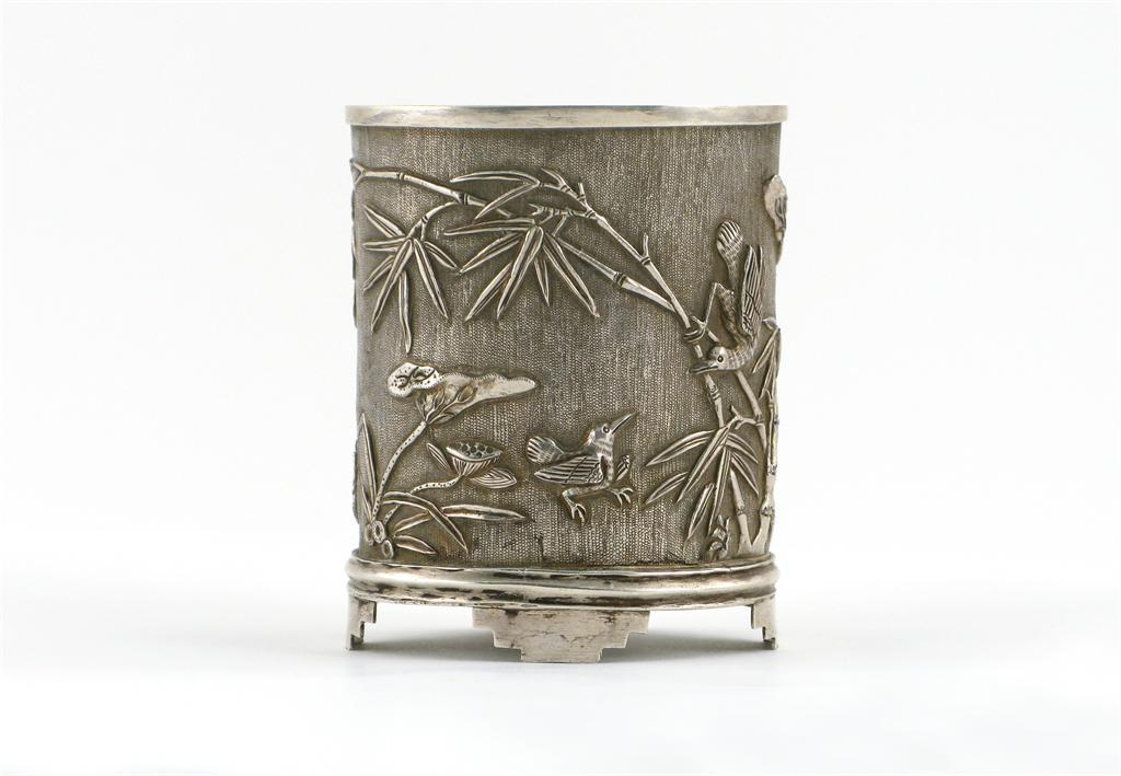 A small silver colour metal oval section vase, decorated in relief with two crabs and acquaitic birds amidst lotus and bamboo, 19th century, 7.6cm.