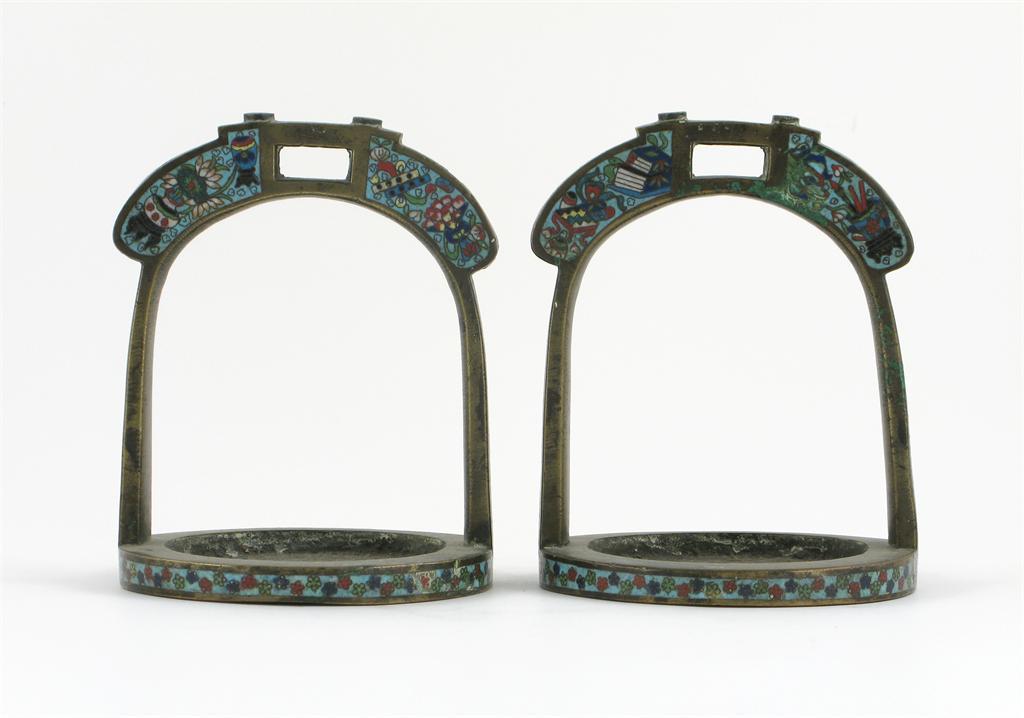 A pair of Chinese cloisonné stirrups, decorated with vases and flowerheads, 16cm high. (2)