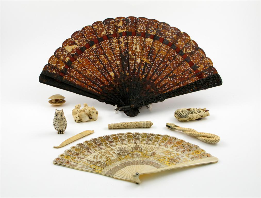 A Japanese ivory carving of seven rats, three character signature, an ivory owl netsuke, a carving of the clams dream, an lacquered inro, a tortoiseshell fan, an ivory fan and five other items, most 19th century, minor damages, 41cm max. (11)