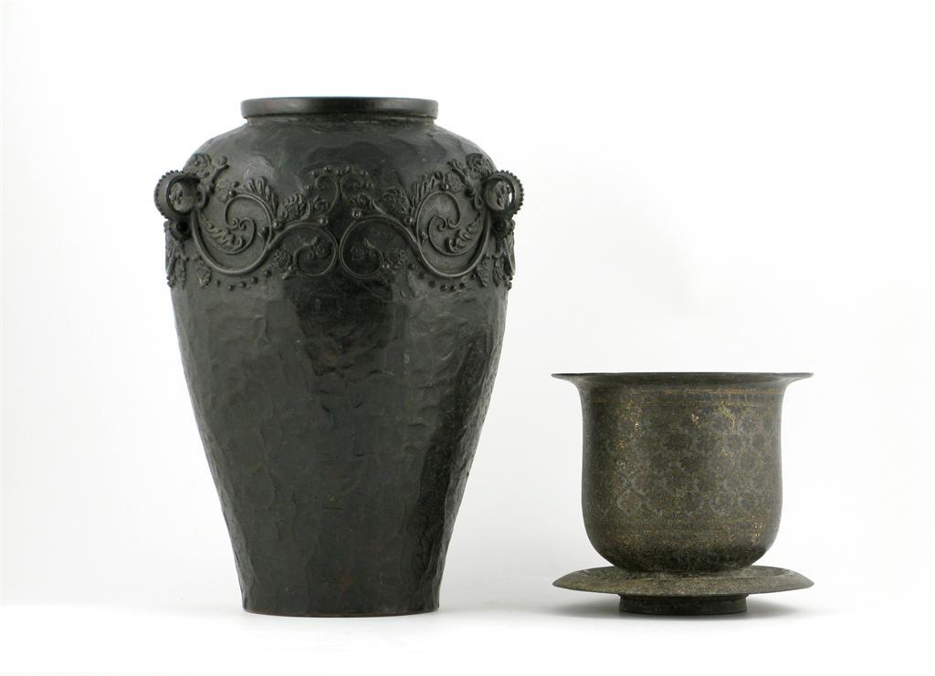 A Bidri-ware U-shaped bowl and stand, delicately inlaid with silver and gold with a formal floral pattern, together with a Japanese bronze three-handled vase, 19th century, 33cm. (3)