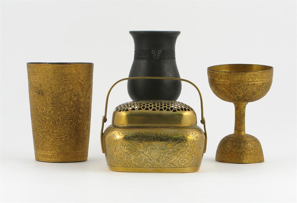 Two Middle Eastern gilt metal drinking vessels, Chinese bronze hu-shaped vase and a brass basket and cover decorated with dragons, 19th/20th century, 13cm max. (5)