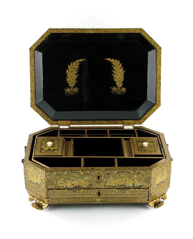 A Chinese black and gold lacquer octagonal workbox, elaborately decorated with many figures, dragons, pagodas and flowerheads, the lid enclosing an arrangement of compartments and trays, above a frieze drawer, all on stylized claw feet, c.1850, minor damages, the feet and some trays perhaps replaced, 35.5cm.