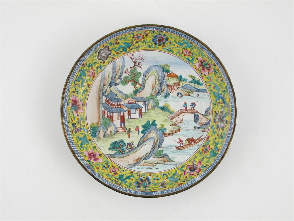 A Chinese Canton enamel saucer dish, painted with five small figures in a landscape, the border with flowers on a yellow band, the reverse with stylized dragon scrolls in blue, 18th century, a little restoration to the back of the rim, 16.2cm.