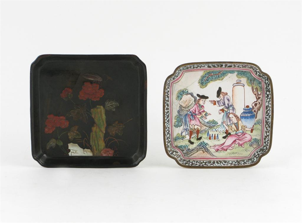 A Chinese Canton enamel European subject small square dish, and a lacquered tortoiseshell tray inset with mother of pearl and coloured stones, with a large beetle, chrysanthemum and rockwork, 18th century, damages, 10.6cm. (2)
