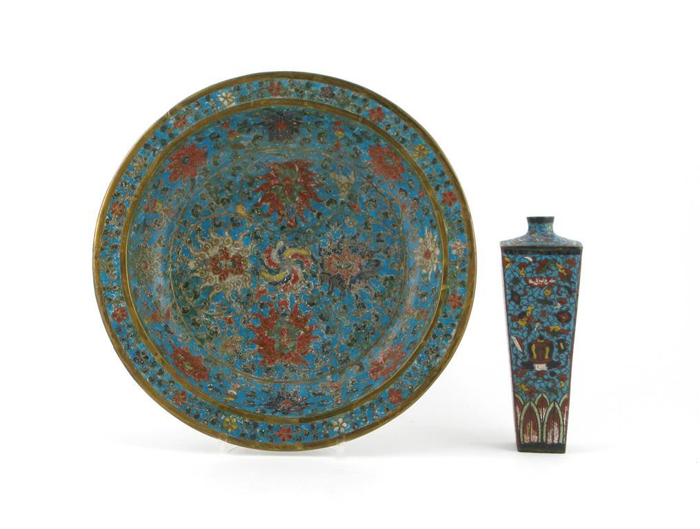 A Chinese cloisonné circular dish, decorated with lotus flower heads and scrolling tendrils on a turquoise ground, raised on three feet, 17th century, and a small Chinese cloisonné square-sectioned vase decorated with Buddhist emblems, both with damages, 25.2cm. (2)