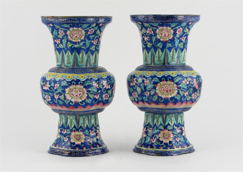 A pair of Chinese Canton enamel famille rose vases, painted with colourful flowers and leaves on a bright blue ground, with key fret ruyi and leaf borders, 19th century, some restoration, 17.4cm. (2)