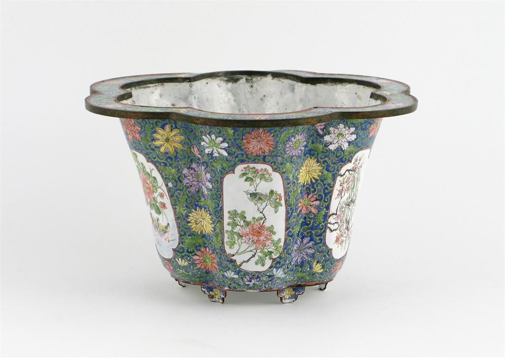 A Chinese Canton enamel hexagonal jardinière, the lobed body painted with panels containing birds and flowers on a blue ground, richly decorated with leaf scrolls and flowerheads, the base with a four character Qianlong mark, 18th or 19th century, damages, 22.3cm.
