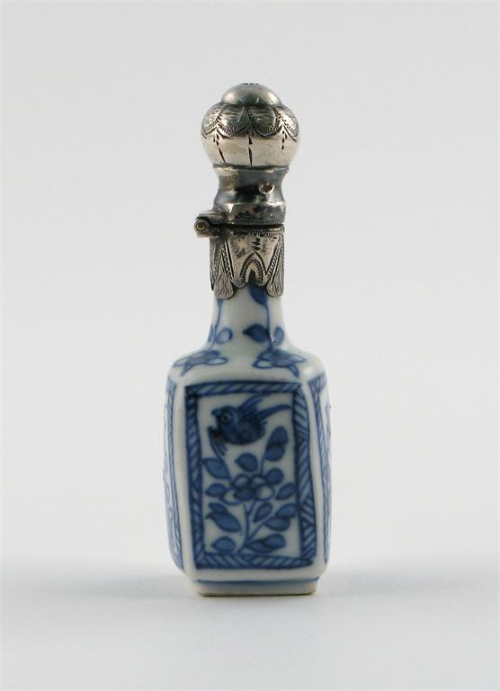 A Chinese blue and white miniature vase, painted with panels of birds and flowers, later mounted as a scent bottle, the porcelain perhaps Kangxi, 7cm.