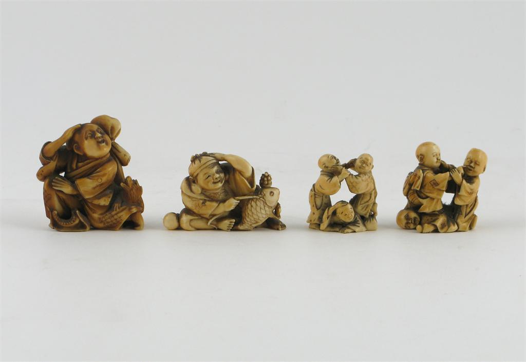 Four Japanese ivory okimono netsukes, carved as figures in various pursuits, all signed, c.1900, two with small chips, 5cm. (4)