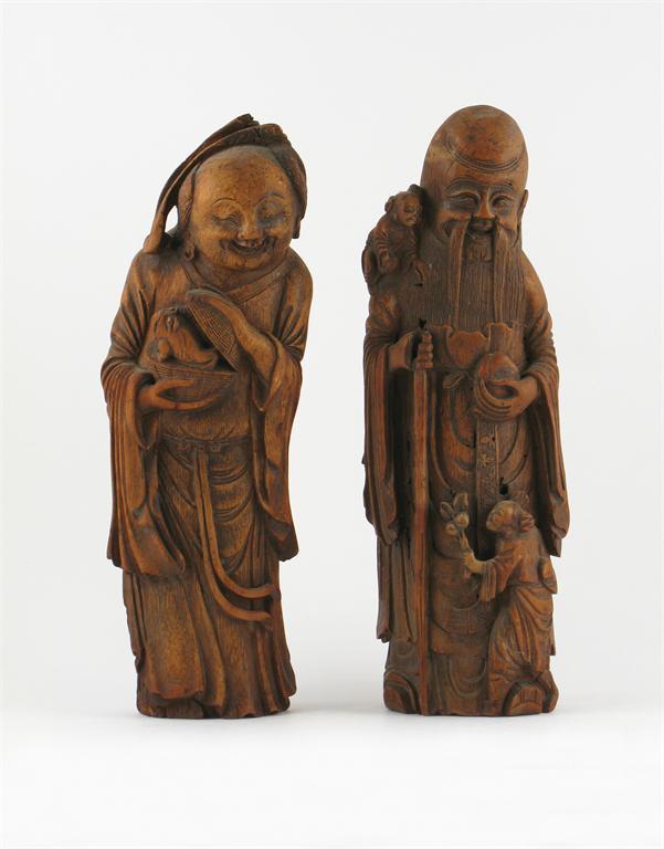 Two Chinese bamboo carvings, one Shoulao, holding a peach with two attendants, the other Liu Hai, carrying his three-legged toad, probably 18th century, damages, 33.5cm. (2)