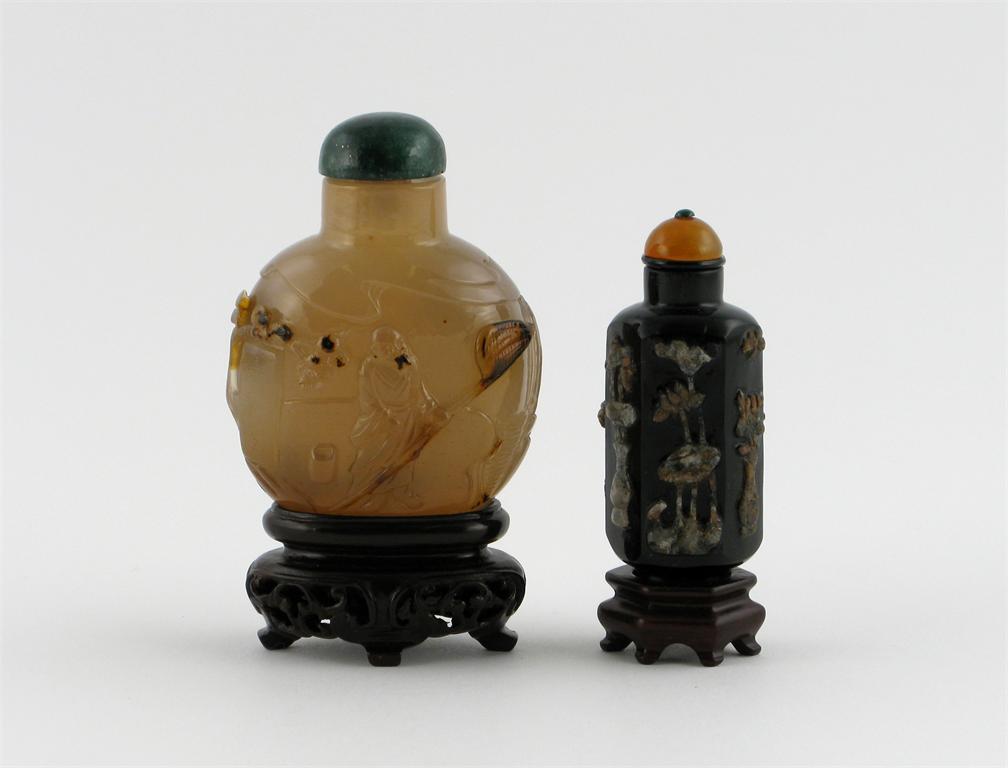 Two Chinese snuff bottles, one chalcedony carved with a man holding a butterfly net and two figures beneath a tree, the other black quartz of hexagonal section, both 19th century, 6.5cm. Both on wood stands. (4)