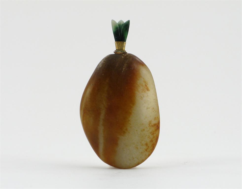 A Chinese snuff bottle, carved from a russet streaked celadon jade pebble, the stopper jadeite, 19th century, 9cm.