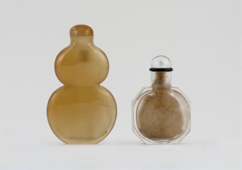 A Chinese agate snuff bottle, of flattened double gourd form, and an octagonal crystal snuff bottle, 7.1cm. (2)