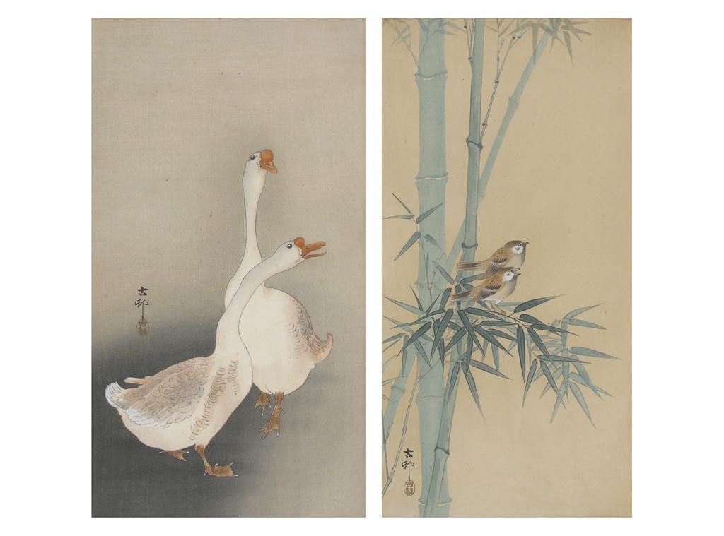Two Japanese watercolours, one depicting two geese, the other with a pair of sparrows perched on bamboo, signed and sealed, c.1920, framed and glazed, 34cm. (2)