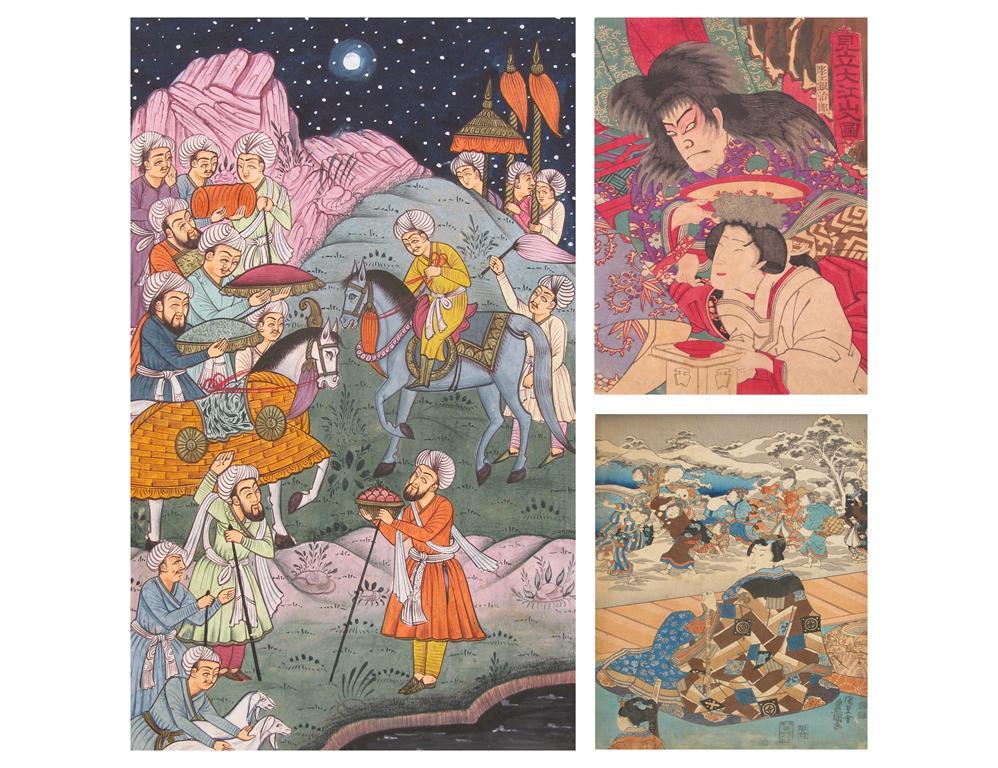 A collection of Japanese woodblock actor prints and Indian miniature paintings