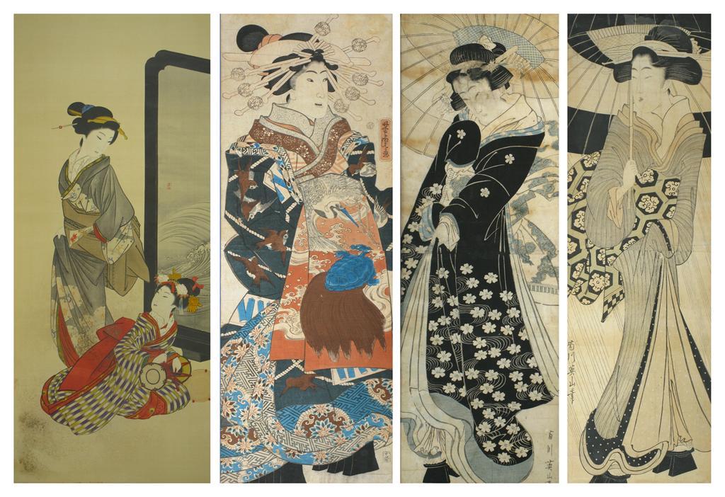 Japanese painting on silk of two equestrian warriors, and three Japanese prints and one painting of bijin (beautiful women), 19th & 20th centuries, 94.5cm max. (5)