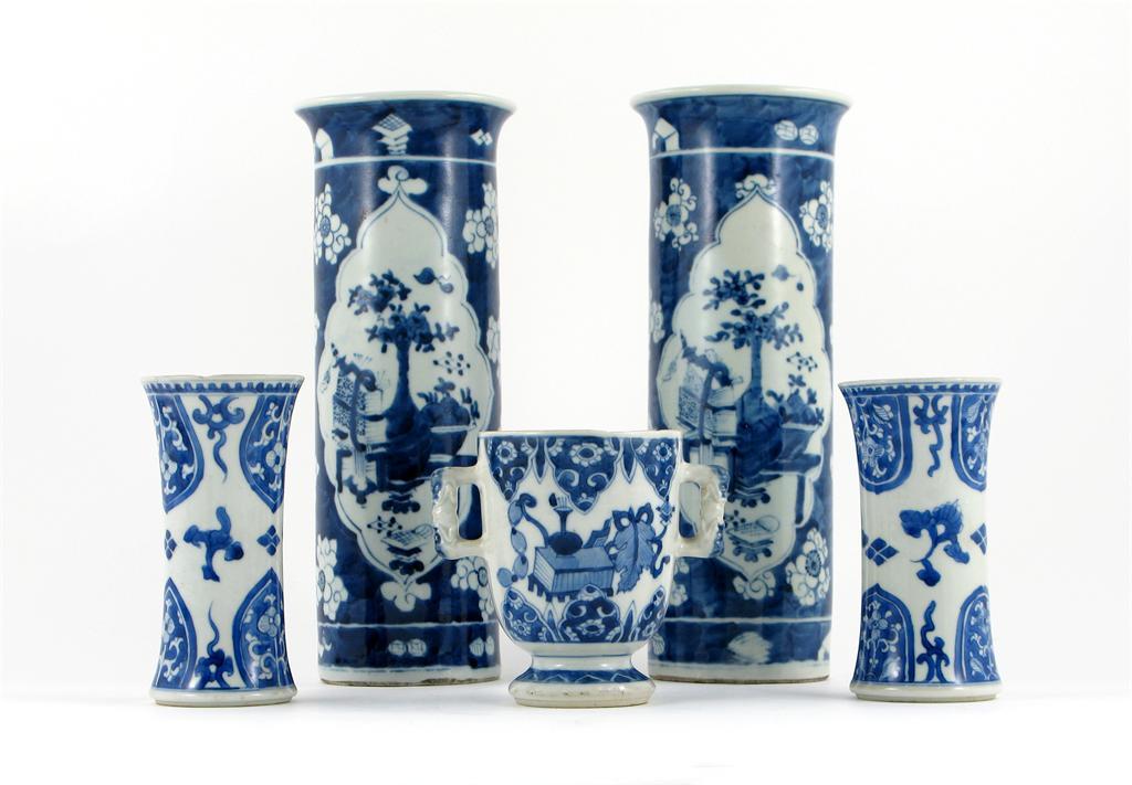 Two pairs of Chinese blue and white vases, painted with vases of fruit and flowers and with stylized panels, and a two handled cup, Kangxi and later, damage and restoration, 27cm. (5)