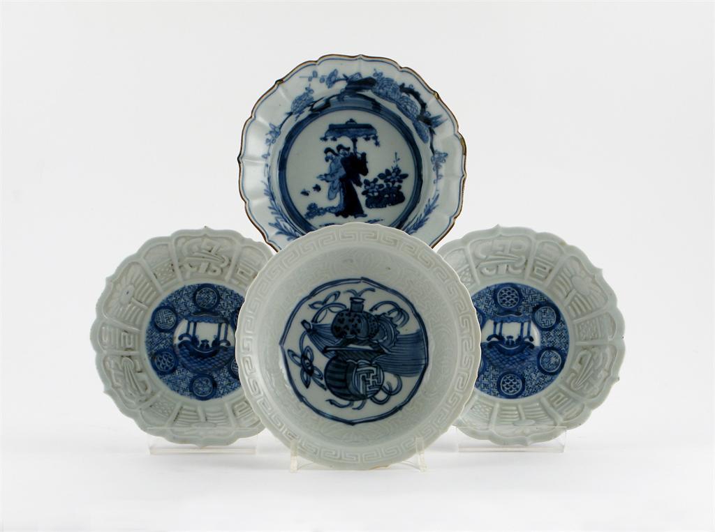 Four Japanese blue and white moulded bowls, variously decorated with figures, pagodas, flowers and textile designs, 18th century and later, minor damages, 14.8cm. (4)