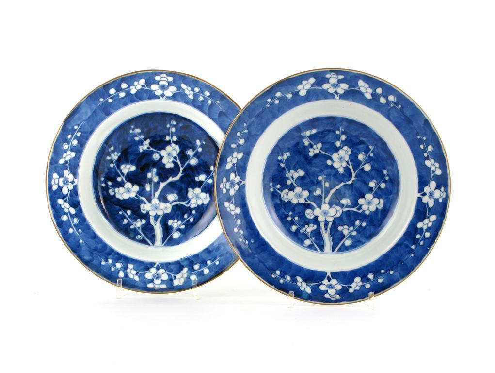 A pair of Chinese blue and white prunus decorated soup plates