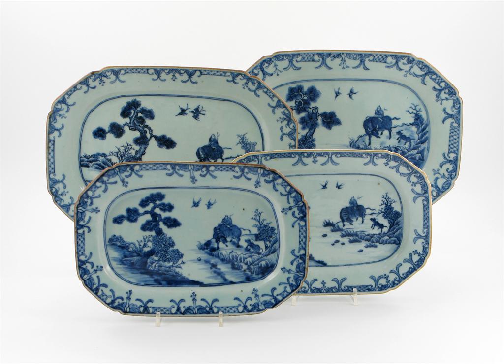 Four Chinese blue and white dishes, each painted with a boy riding a water buffalo on the banks of a river, all 18th century, one small dish chipped, 30.5cm. (4)