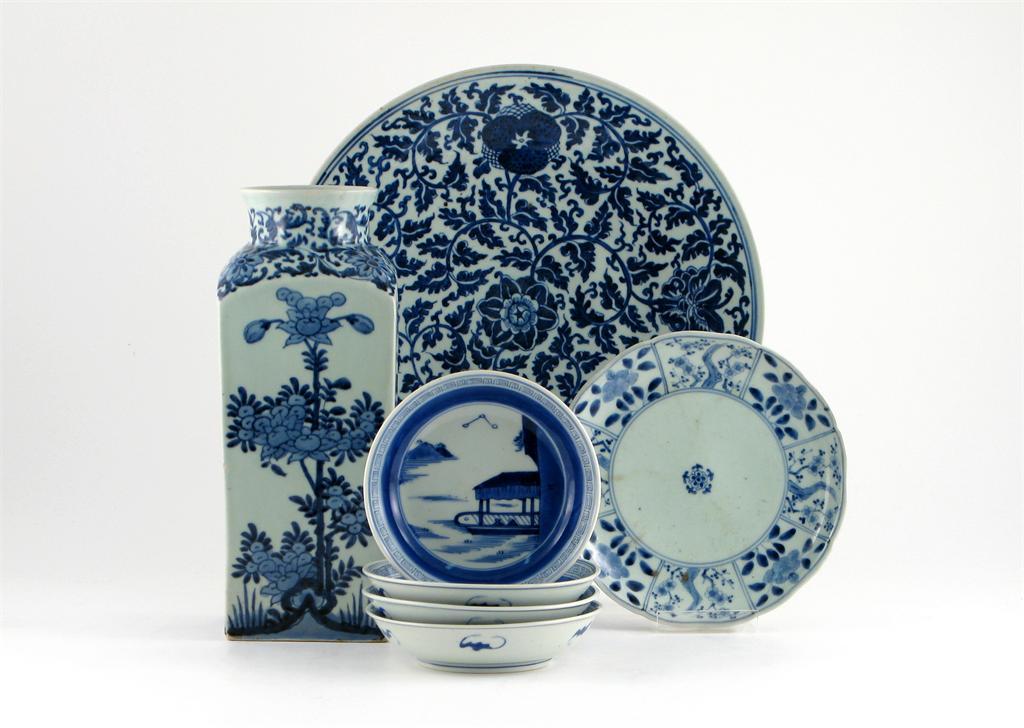 A Japanese blue and white square section jar, painted with flowers and foliage, c.1700, together with six various blue and white dishes, 35.4cm max. (7)