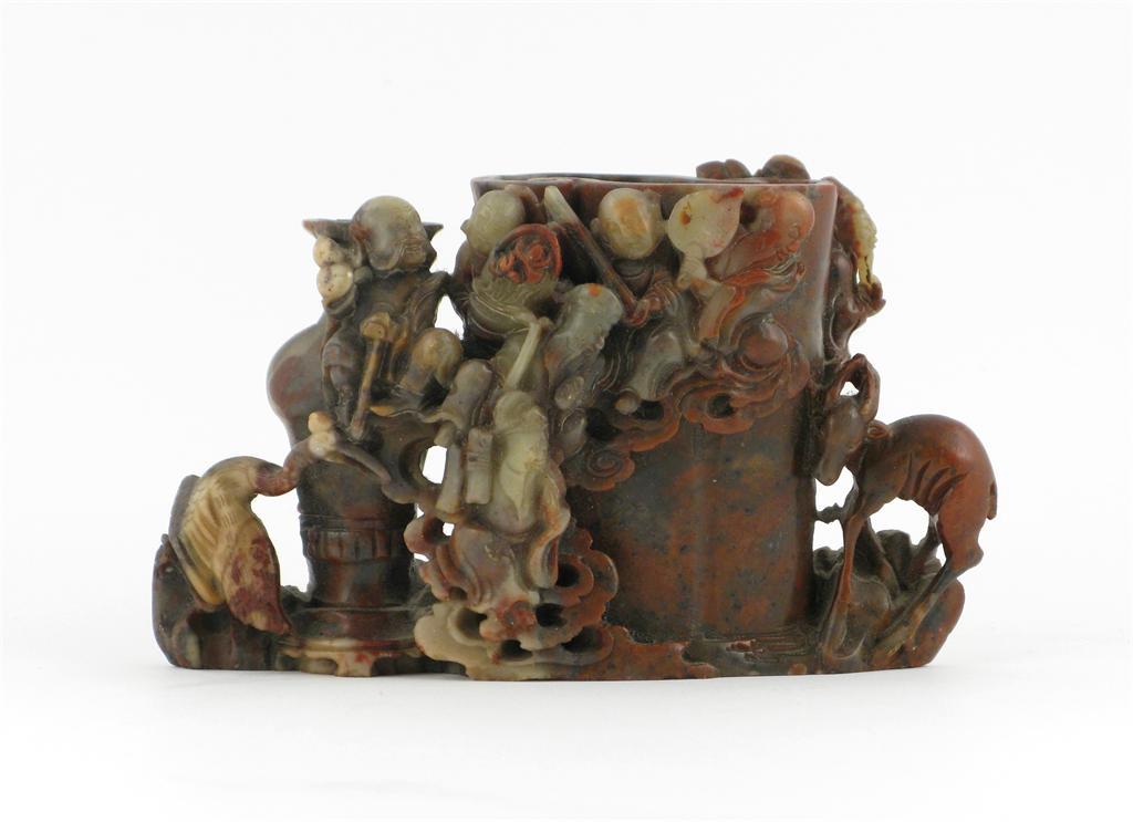 A Chinese soapstone vase, carved with eight figures issuing from clouds with a stork and a deer to the base, 19th century, 13cm.