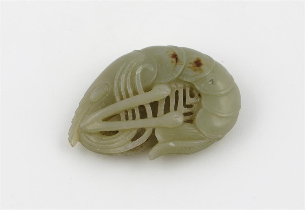 A Chinese jade carving of a prawn, the brown skin used to highlight details, 6.5cm.