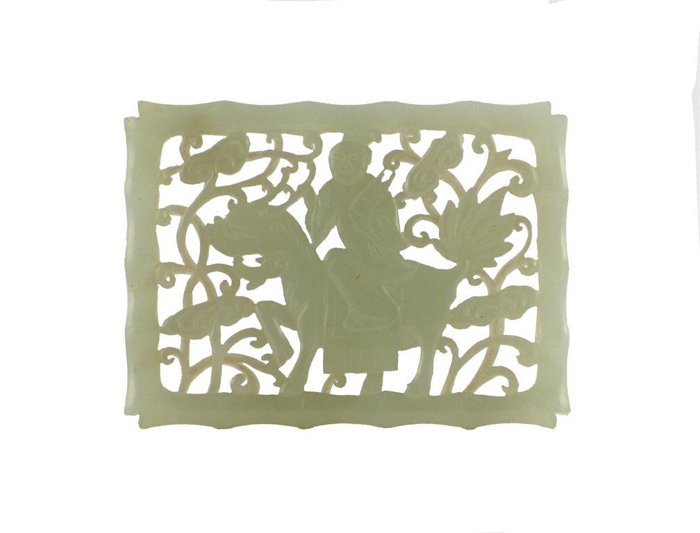 A Chinese rectangular jade plaque, reticulated and carved with a figure riding a mythical beast amidst a forest of rui, 7cm.