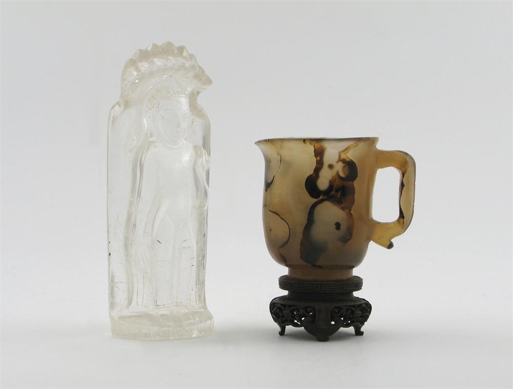 A rock crystal carving of Buddha, standing with his left arm raised, and an agate pouring vessel, raised on a wood stand, 15.5cm max. (2)