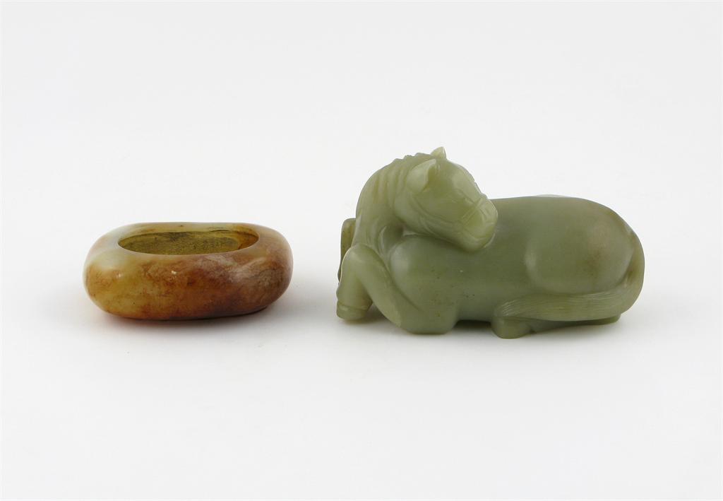 A Chinese jade carving of a horse, recumbent with its head turned, together with a soapstone brushwasher, 20th century, 13cm. (2)