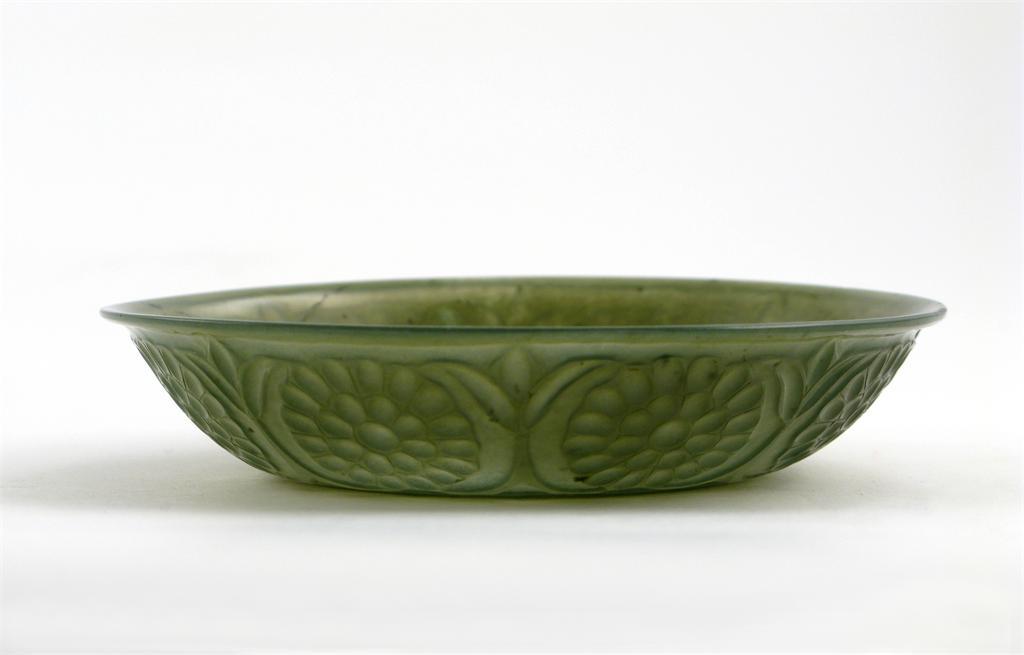 A Moghul-style spinach jade shallow bowl, the sides carved with eight chrysanthemum heads, the base with a eight pointed star, 12.8cm.