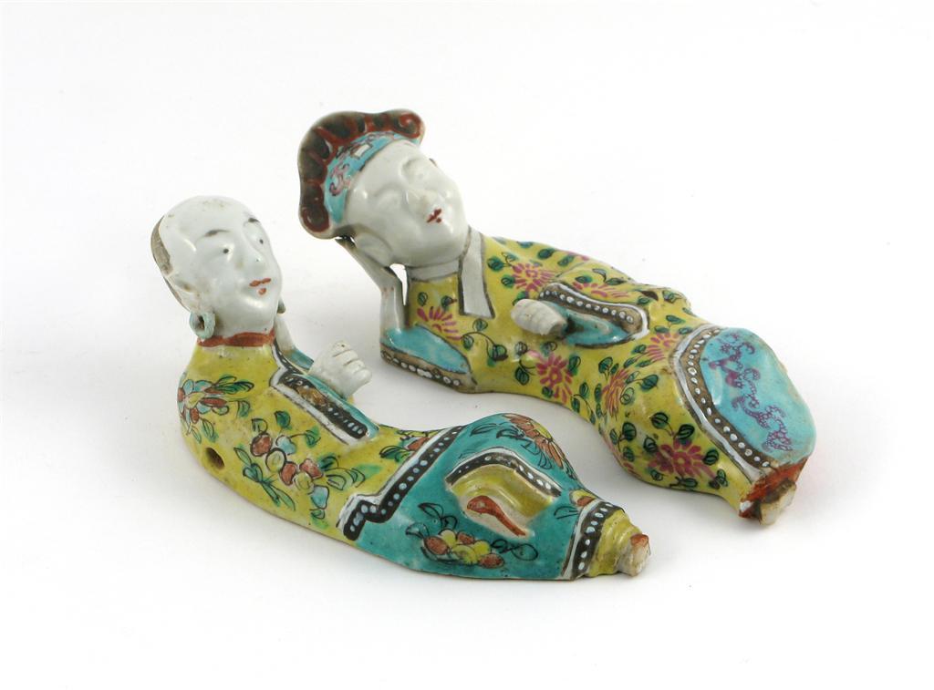 Two Chinese porcelain brush rests, modelled as reclining figures of a man and woman, decorated with floral yellow robes, 19th/20th century, 17cm. (2)