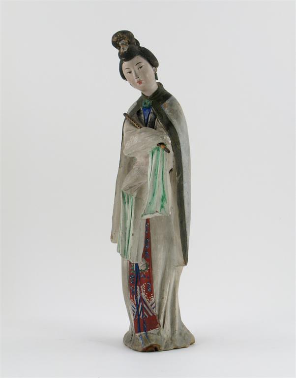 A Chinese painted plaster standing figure of a female flautist, wearing flowing robes and holding a bamboo flute, her head detachable, 18th century, some wear and damage, 38cm.
